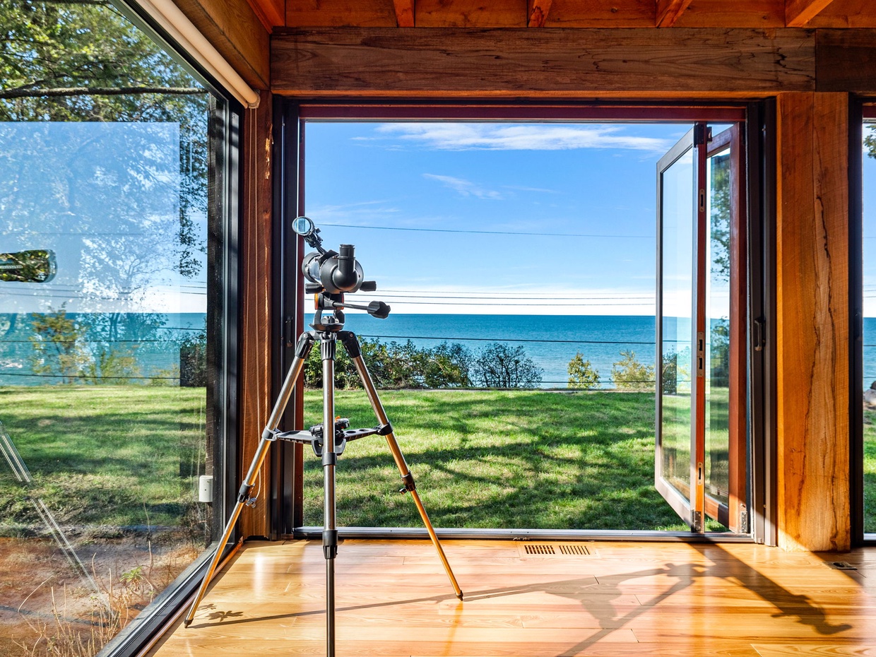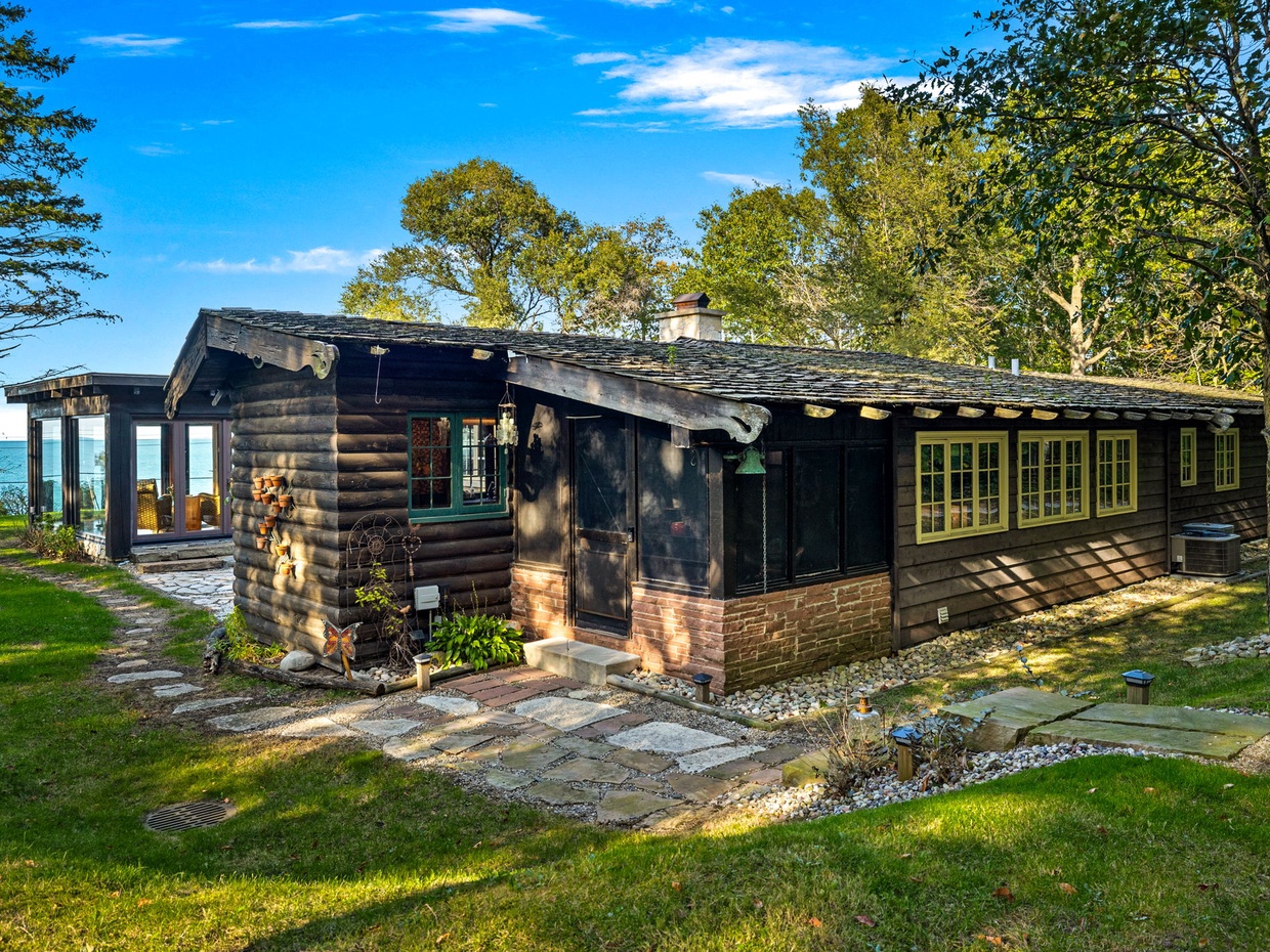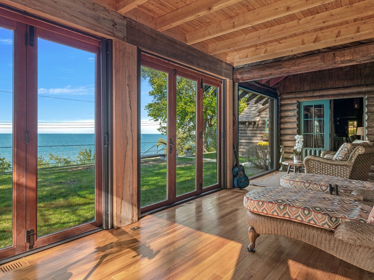 A former screened porch, now a four-season room with foldable glass doors and floor-to-ceiling windows, affords terrific views of the lake. The house (which has had additions built on over the years) has been updated with all the modern comforts, including a whole-house sound system, new bathrooms (one with steam shower), a movie screening room and fire pit.