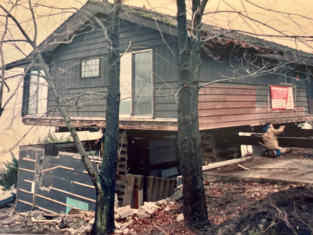 The house move took three days and was the talk of the town. Neighbors came out to watch the progress. Some were not happy that power lines were temporarily moved to make way for the house. The house survived completely intact—not a crack to the chimney—and was supported on piers to await spring, when a raised basement was built up under it meet the house, and a bedroom/bath and garage were added.