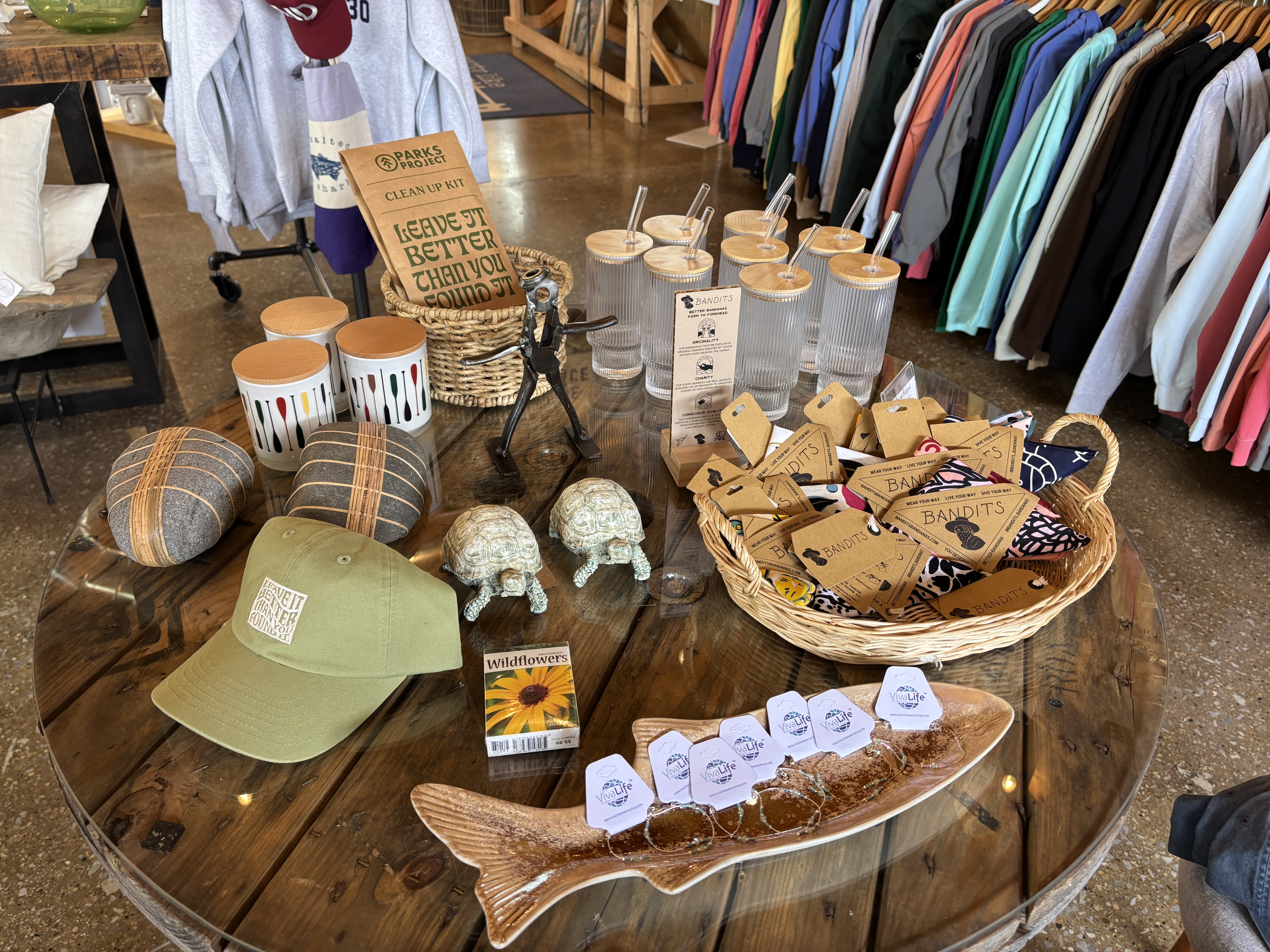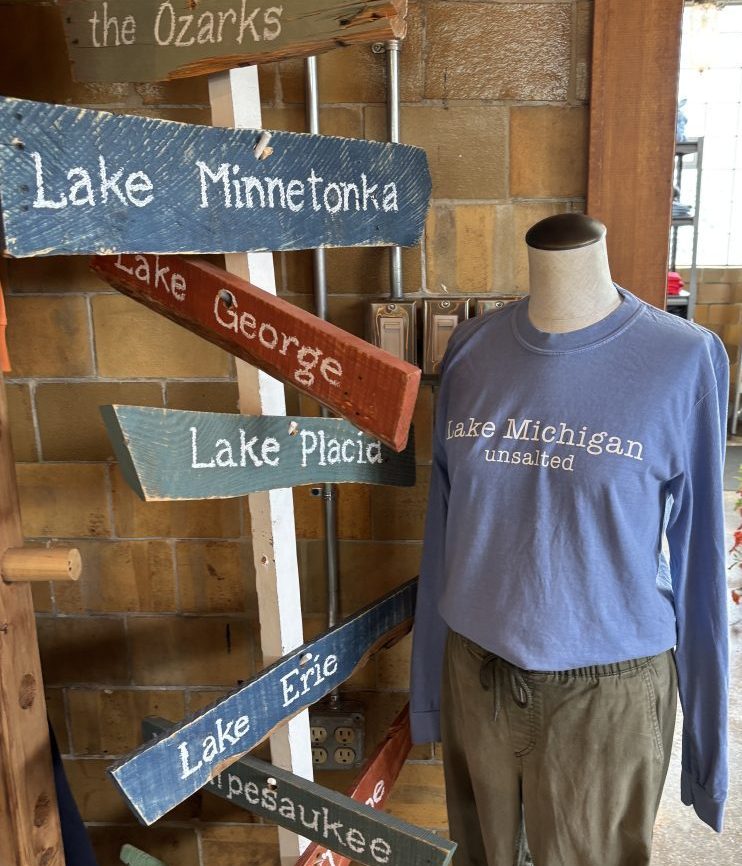 In addition to No Sharks merchandise (T-shirts, hats, hoodies, coozies), The Standard features the work of local artisans such as Beach Bum jewelry, candles from Nest No. 4, and dune- and lake-related art by Bunny Dimke.