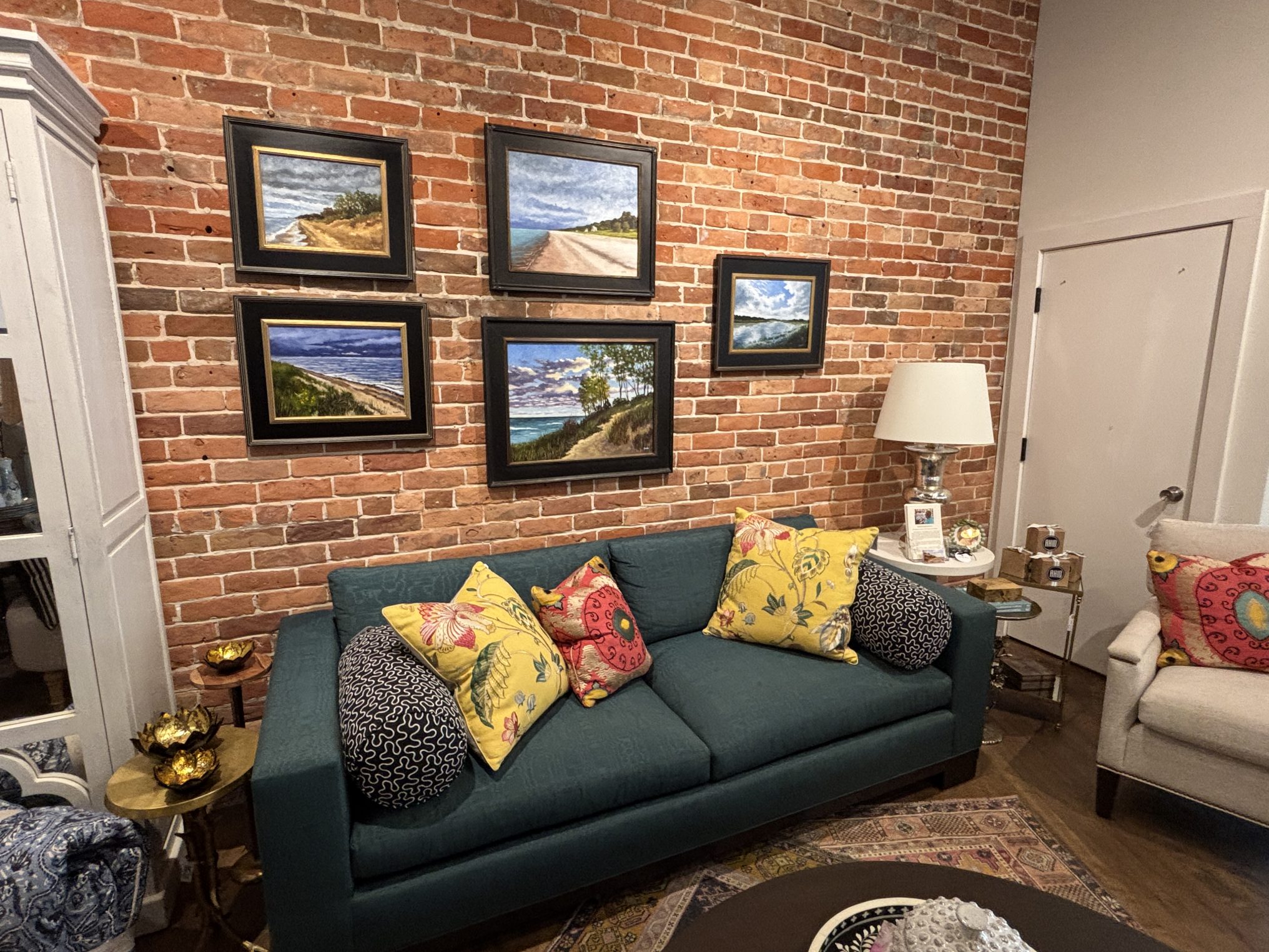 She also carries items typically available only to “the trade” (design professionals)–wallcoverings, lighting, area rugs and home accessories. You can also pick up gifty items such as candles, tea towels and napkins, or the work of a few local artists, including Amy Renzulli, whose mixed-media pieces have beachy themes with an edge (lower center).
