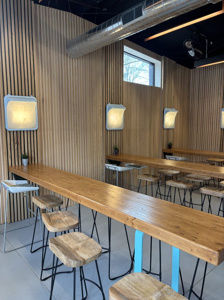 Betts and his father did a lot of the renovation work themselves. “Chris had a very specific vision,” Raba says, of a light and bright space that people “would feel comfortable hanging out in.” The tasting room is family friendly, and dogs are welcome on the patio.